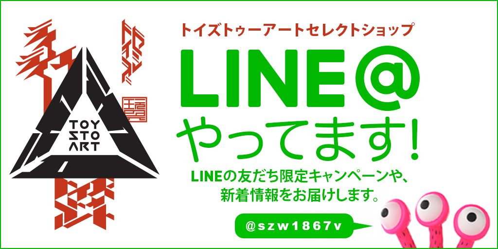 「LINE@」では、「友だち追加」して頂いた会員様に対してToys To Artの最新商品情報やレビュー、気になるアーティストとのインタビューなど、お得な情報を発信していきます。LINEを使っている方はぜひ登録してみてください。